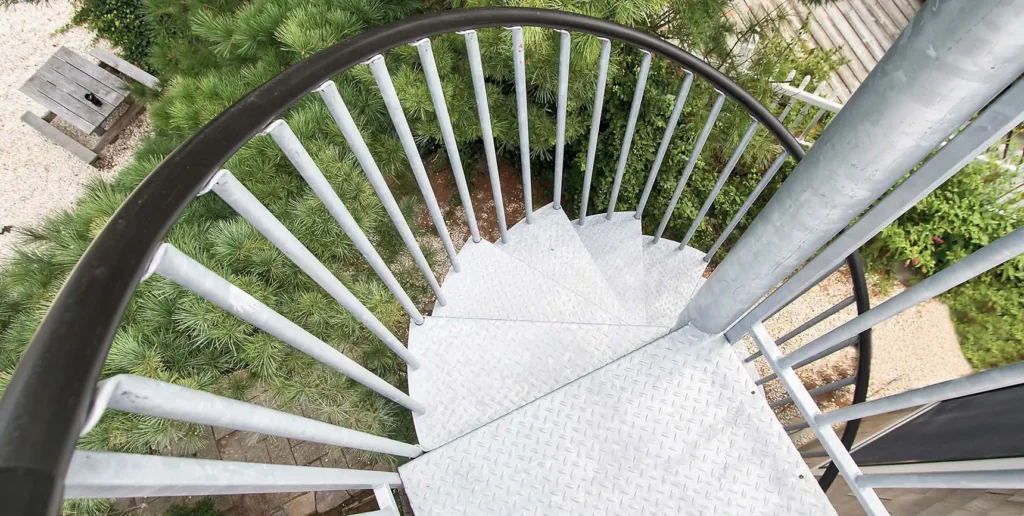 Outdoor spiral stairs approach the same problem differently. Instead of stretching out, the stair stacks its steps vertically around a central column.
