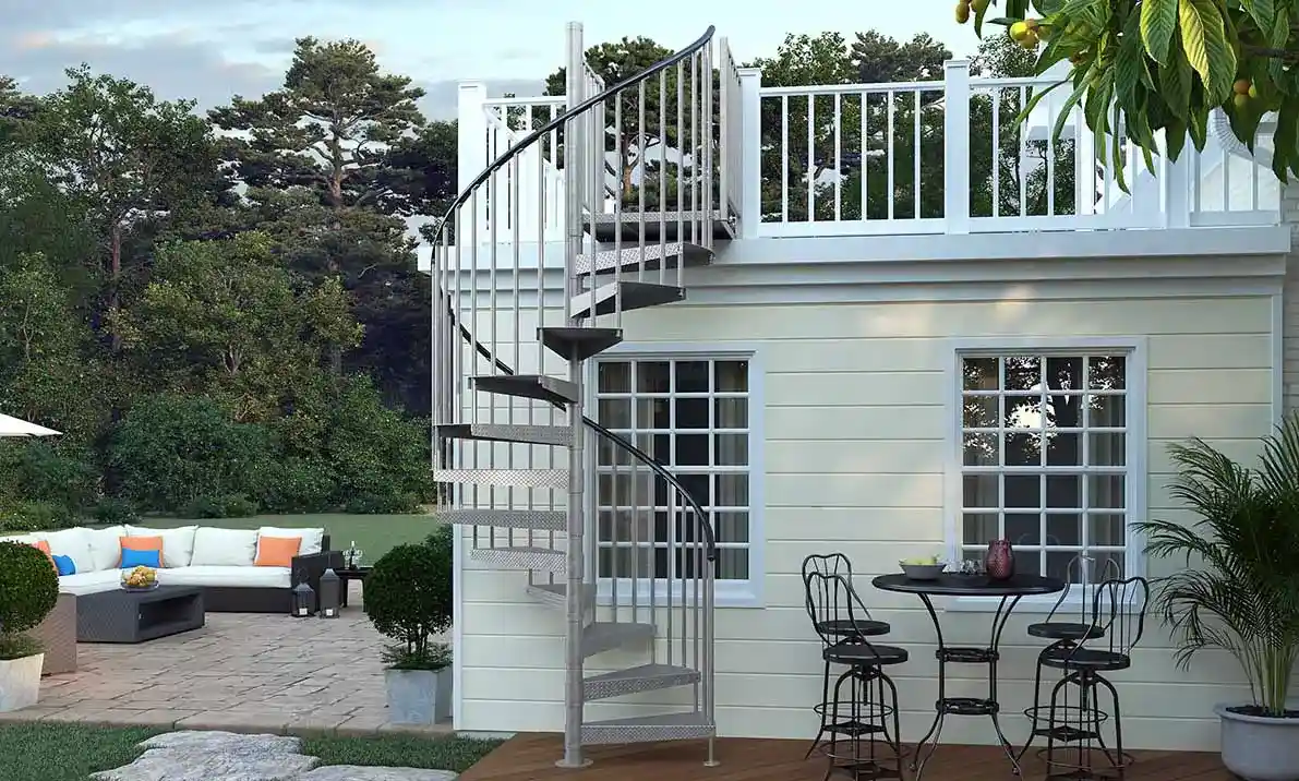 The Expedition Spiral Stair offers a code compliant option package, making it the perfect solution for your backyard deck our outdoor living space. These International Building Code compliant staircases quickly ship to you so your timeline is met.