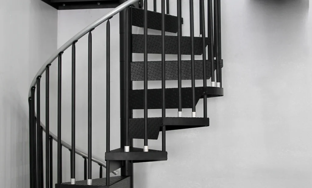 Garages and boathouses are not exempt from needing staircases either. For these spaces, a more industrial look might fit in well, with raised treads for helping you grip while you carry things in and out. For spaces like this, spiral stairs allow access without taking up precious storage space. A premade outdoor steps kit is ideal for a space like this because you can assemble it yourself without having to empty the space for a contractor to come in.